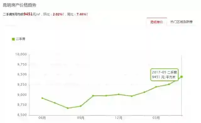 在某网站上的房价走势图上,昆明二手房均价从2017年1月以来,每个月都上涨,到5月份均价为9451元/平方米。